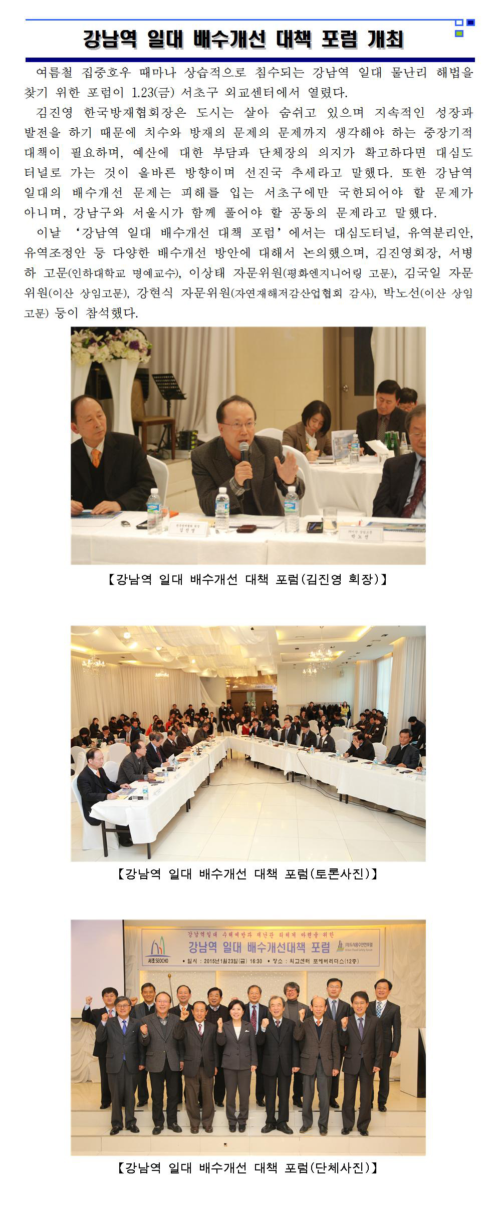 강남역 일대 배수개선 대책 포럼 개최 2015-01-26 목록보기 이전글김진영 회장 '새누리당 재해대책위원회 위원'으로 임명2015.01.26 다음글[부고] 국민안전처 교육연구단지 등 건립추진단 김인한 단장 모친상 알림2015.01.26