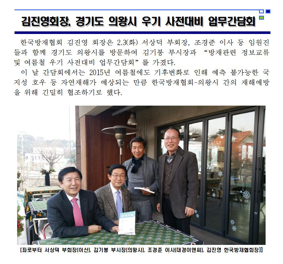 김진영회장, 경기도 의왕시 우기 사전대비 업무간담회 2015-02-03 목록보기 이전글제31회 방재전문인력 인증시험 합격자 공고(1.30)2015.02.11 다음글[언론보도] 김진영회장, 재해대책특위 운영방안 토론회 참석2015.01.27