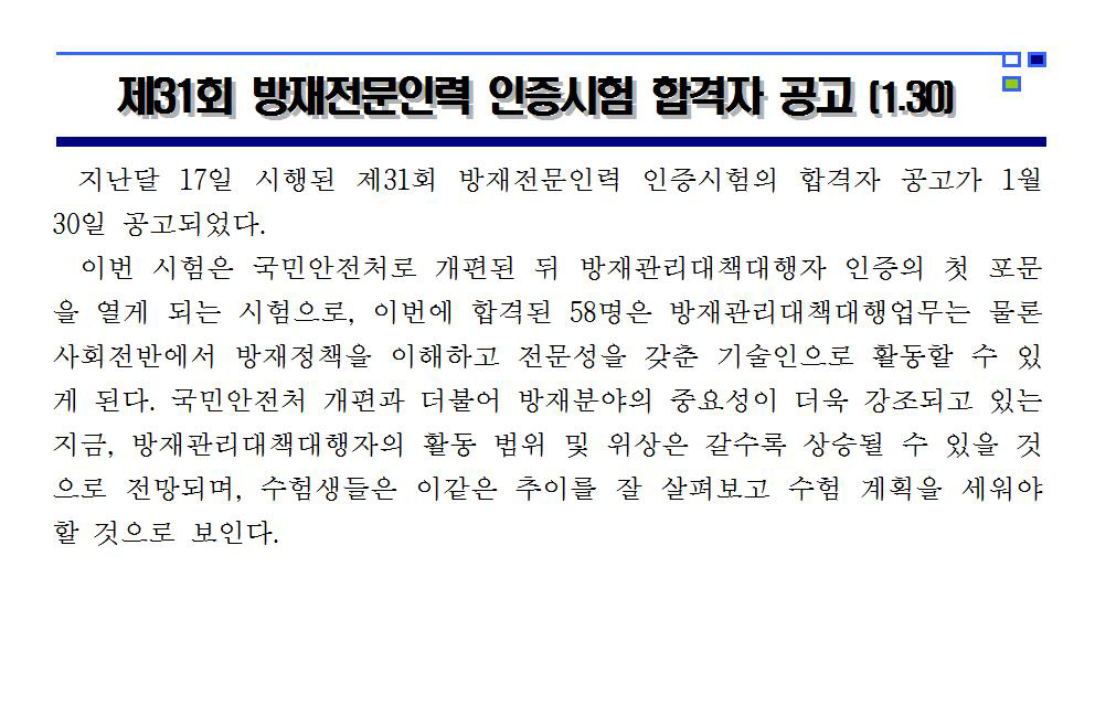 제31회 방재전문인력 인증시험 합격자 공고(1.30) 2015-02-11 목록보기 이전글재난대응역량 강화를 위한 서울특별시 재난업무담당자 공동연수2015.02.11 다음글김진영회장, 경기도 의왕시 우기 사전대비 업무간담회2015.02.03