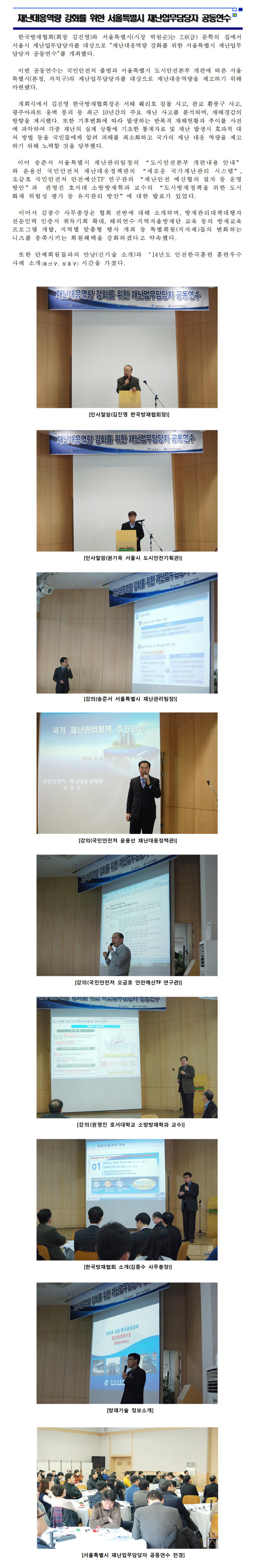 재난대응역량 강화를 위한 서울특별시 재난업무담당자 공동연수 2015-02-11 목록보기 이전글[협회장 특별기고] 光州 대화아파트 붕괴사고의 재조명2015.02.11 다음글제31회 방재전문인력 인증시험 합격자 공고(1.30)2015.02.11
