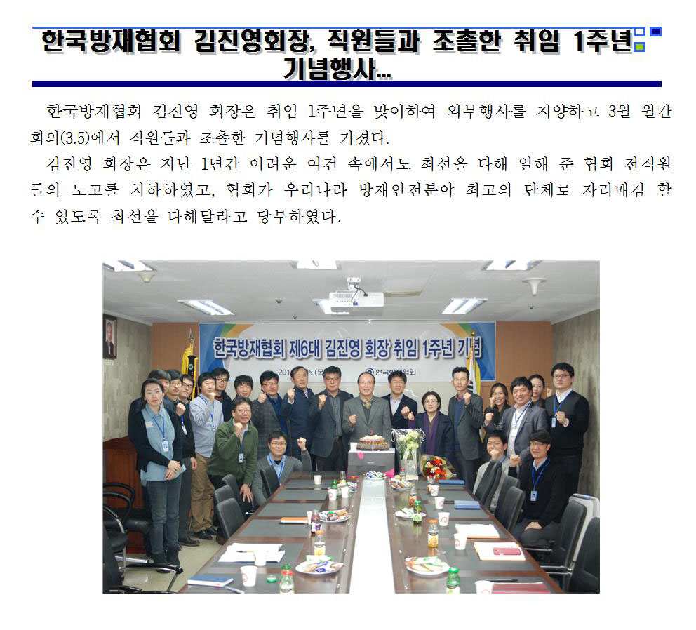 한국방재협회 김진영회장, 직원들과 조촐한 취임 1주년 기념행사 2015-03-11 목록보기 이전글김진영 회장, 2015 자연친화적 하천관리 워크숍 축사 및 2015 하천업무유공자 국토교통부장관 표창상 수상2015.03.11 다음글[부고] 국민안전처 홍경우실장(중앙재난안전상황실) 별세2015.03.09