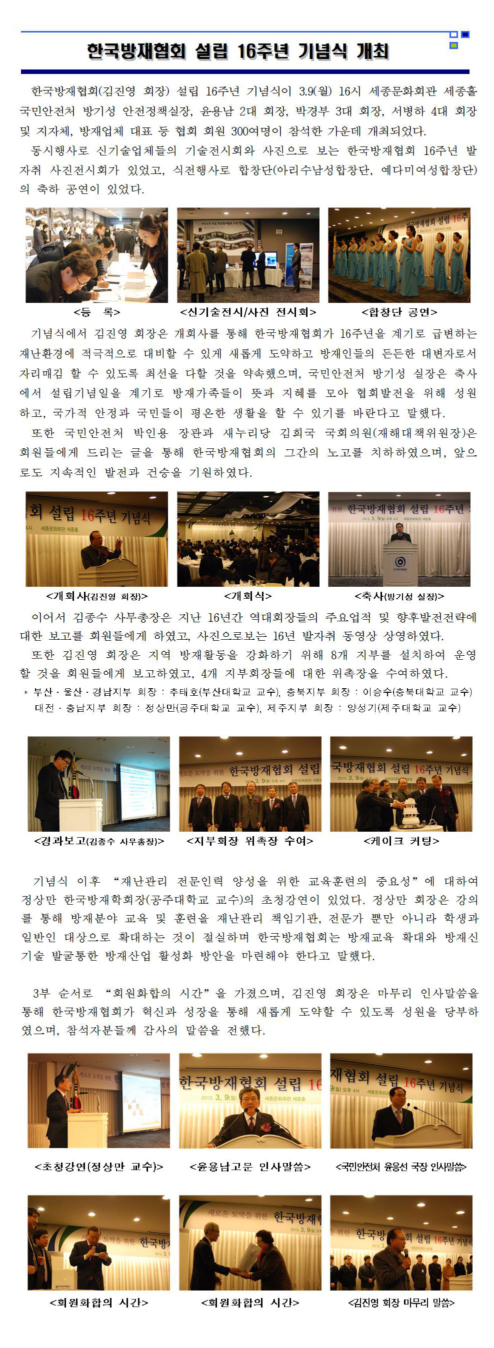 한국방재협회 설립 16주년 기념식 개최 2015-03-11 목록보기 이전글김진영회장, 『대구광역시 풍수해저감종합계획 공청회』참석2015.03.17 다음글김진영 회장, 2015 자연친화적 하천관리 워크숍 축사 및 2015 하천업무유공자 국토교통부장관 표창상 수상2015.03.11