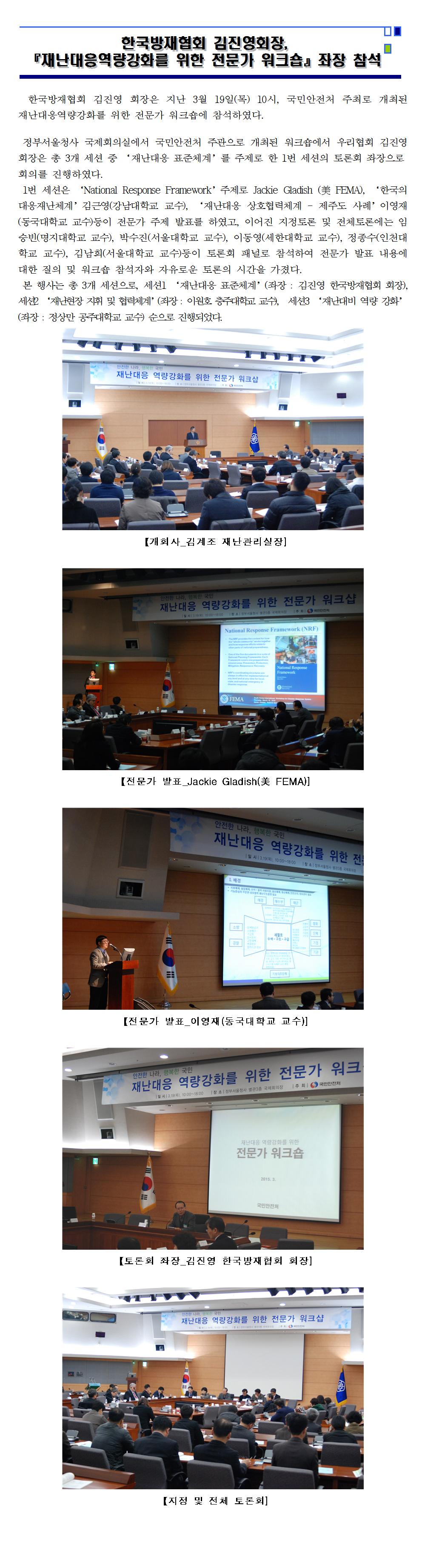 김진영 회장, 『재난대응역량강화를 위한 전문가 워크숍』좌장 참석 2015-03-19 목록보기 이전글방재신기술지정 종합평가위원회 실시2015.03.20 다음글김진영회장, 『대구광역시 풍수해저감종합계획 공청회』참석2015.03.17