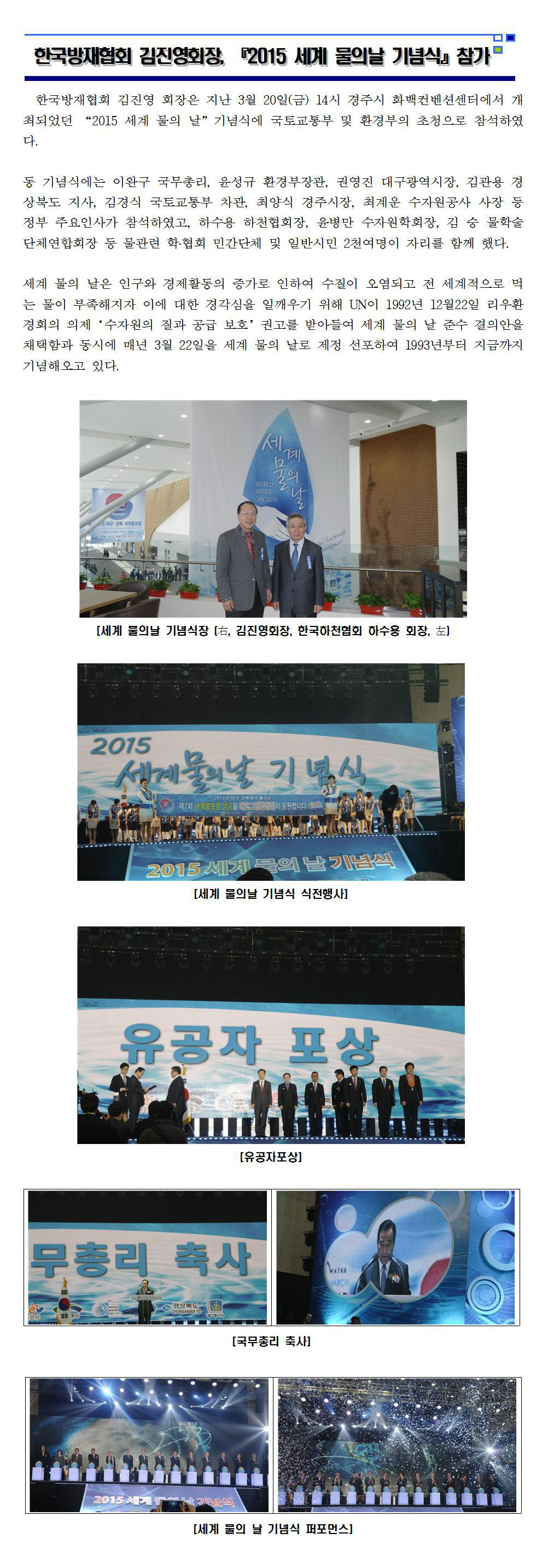 김진영회장, 『2015 세계 물의날 기념식』참가 2015-03-23 목록보기 이전글[부고] 우리협회 이종팔 자문위원 부인 별세2015.04.05 다음글방재신기술지정 종합평가위원회 실시2015.03.20