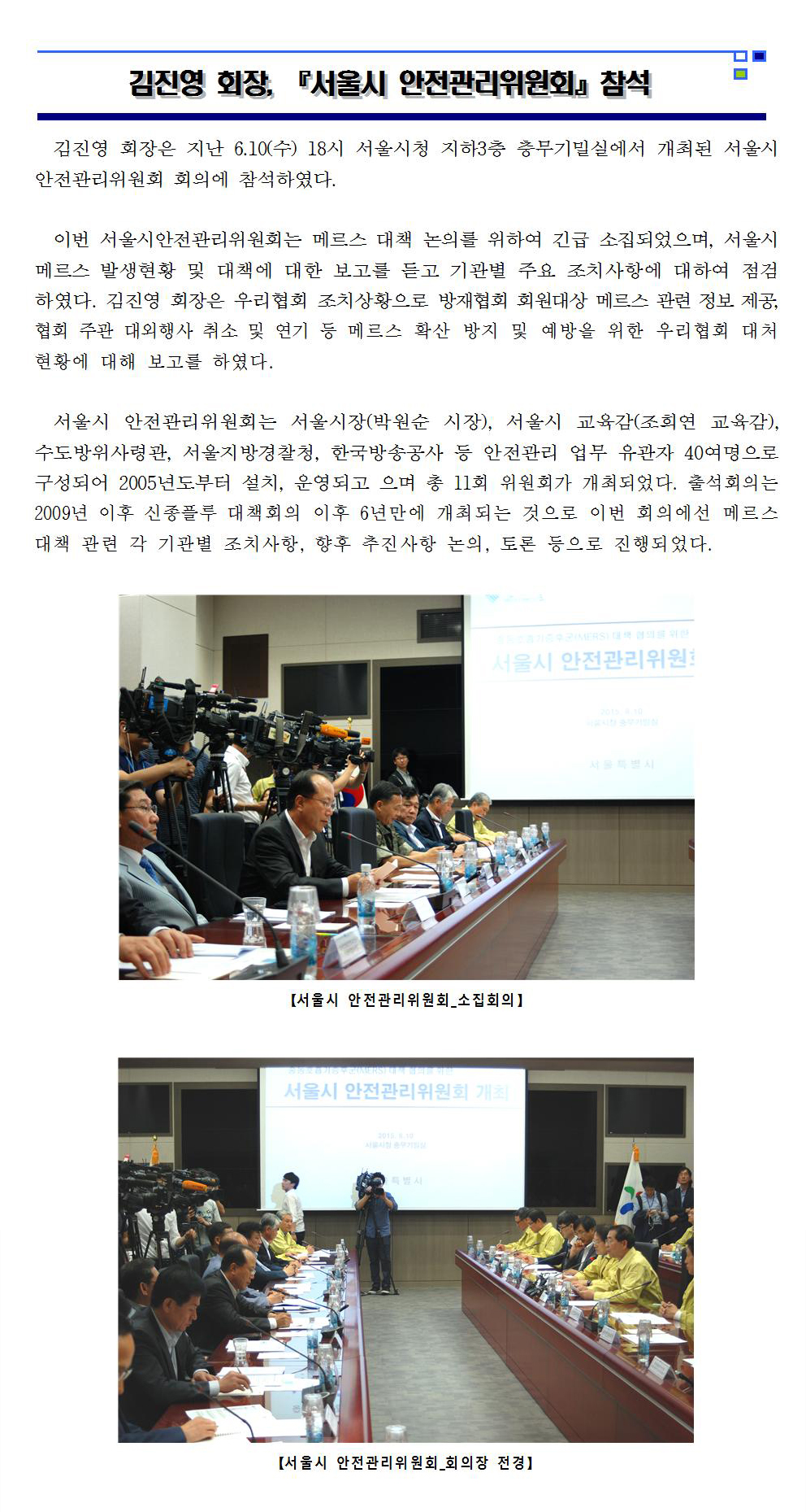 김진영 회장, 『서울시 안전관리위원회』참석 2015-06-12 목록보기 이전글2015년 제3회(66기) 방재분야특수전문교육 수료2015.06.22 다음글'2015 자연재해대책유공 정부포상 및 장관표창 전수식' 개최2015.06.09