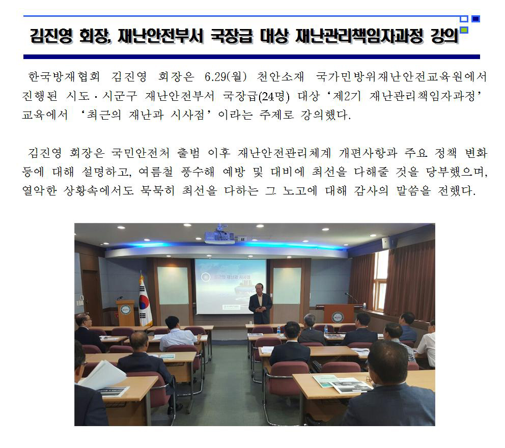 김진영 회장, 재난안전부서 국장급 대상 재난관리책임자과정 강의 2015-06-30 목록보기 이전글2015년 제2회(65기) 방재분야특수전문교육 수료2015.07.01 다음글방재신기술지정 평가위원회 개최2015.06.23