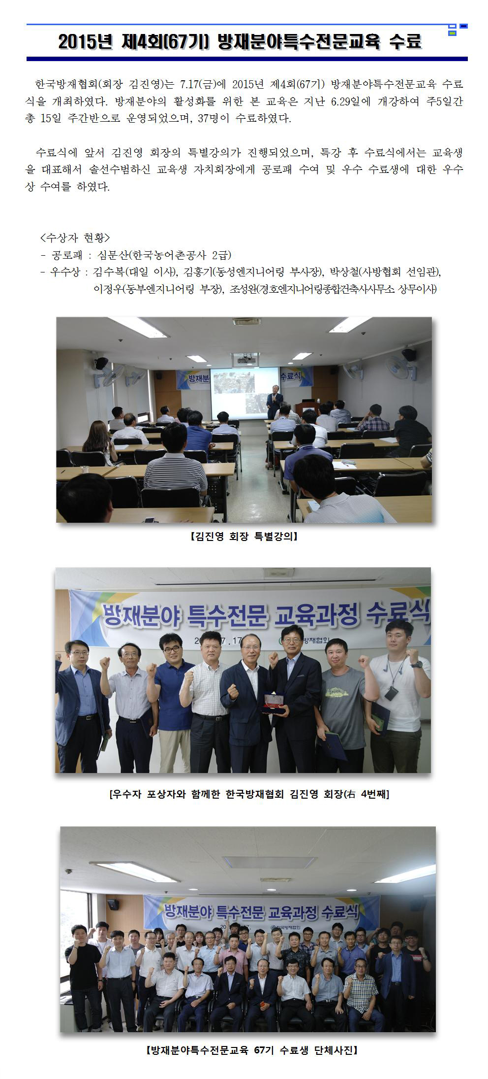 2015년 제4회(67기) 방재분야특수전문교육 수료 2015-07-21 목록보기 이전글협회 정기간행물 『방재저널(64호)』 발간2015.07.21 다음글방재신기술 보호기간연장 평가위원회 개최2015.07.20