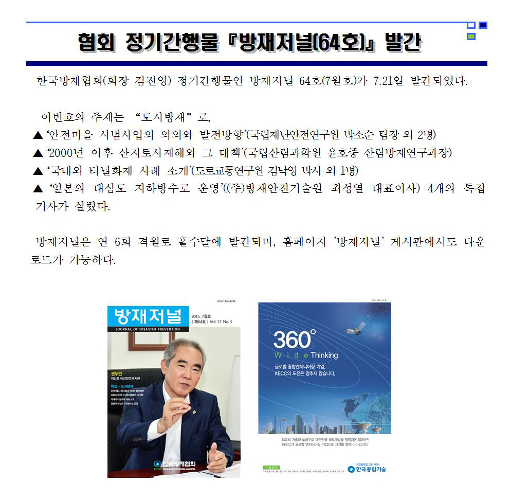 협회 정기간행물 『방재저널(64호)』 발간 2015-07-21 목록보기 이전글[부고] 우리협회 이사 한국농어촌공사 수자원운영처 강병문 처장 모친상 알림2015.07.27 다음글2015년 제4회(67기) 방재분야특수전문교육 수료2015.07.21