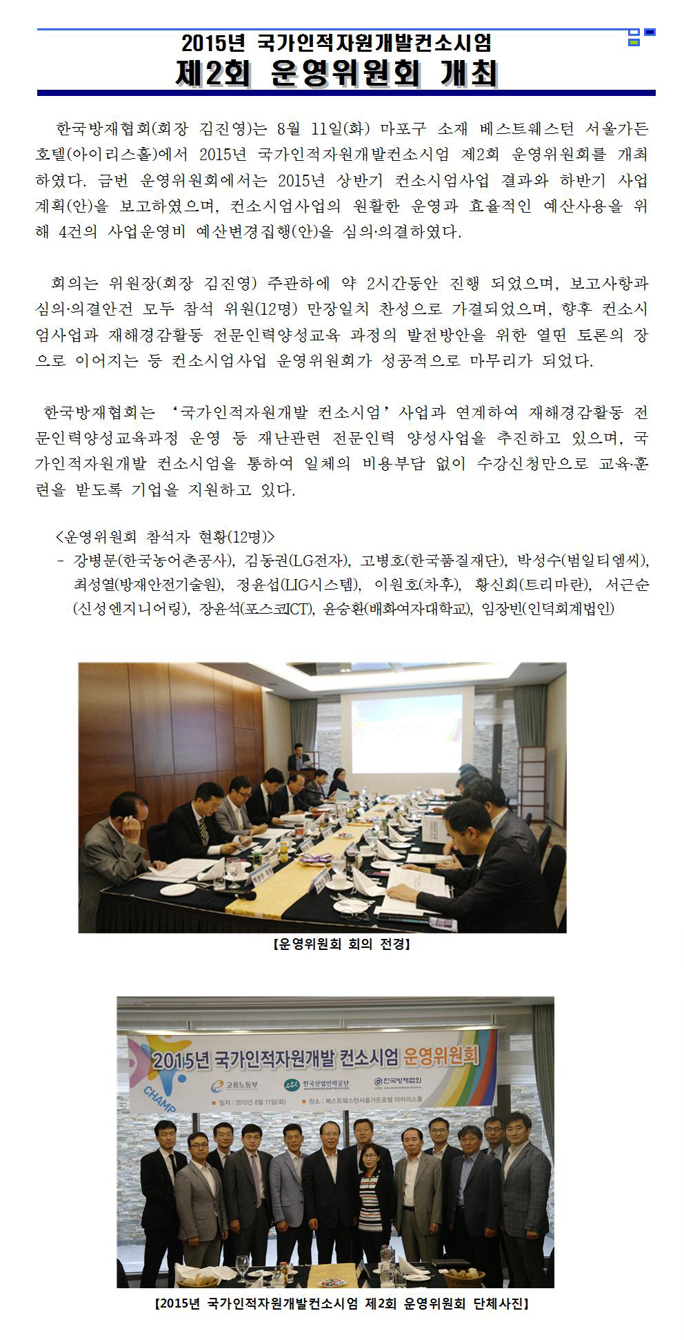 2015년 국가인적자원개발컨소시엄 제2회 운영위원회 개최 2015-08-11 목록보기 이전글방재저널 제65호 편집기획회의 개최2015.08.13 다음글방재신기술 보호기간 연장 평가위원회 개최2015.08.07