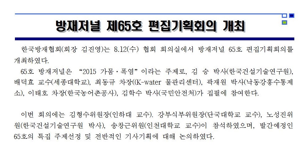 방재저널 제65호 편집기획회의 개최 2015-08-13 목록보기 이전글[축결혼] 우리협회 평생회원 (주)도화엔지니어링 윤용진 부사장의 자녀 결혼식 알림2015.08.25 다음글2015년 국가인적자원개발컨소시엄 제2회 운영위원회 개최2015.08.11