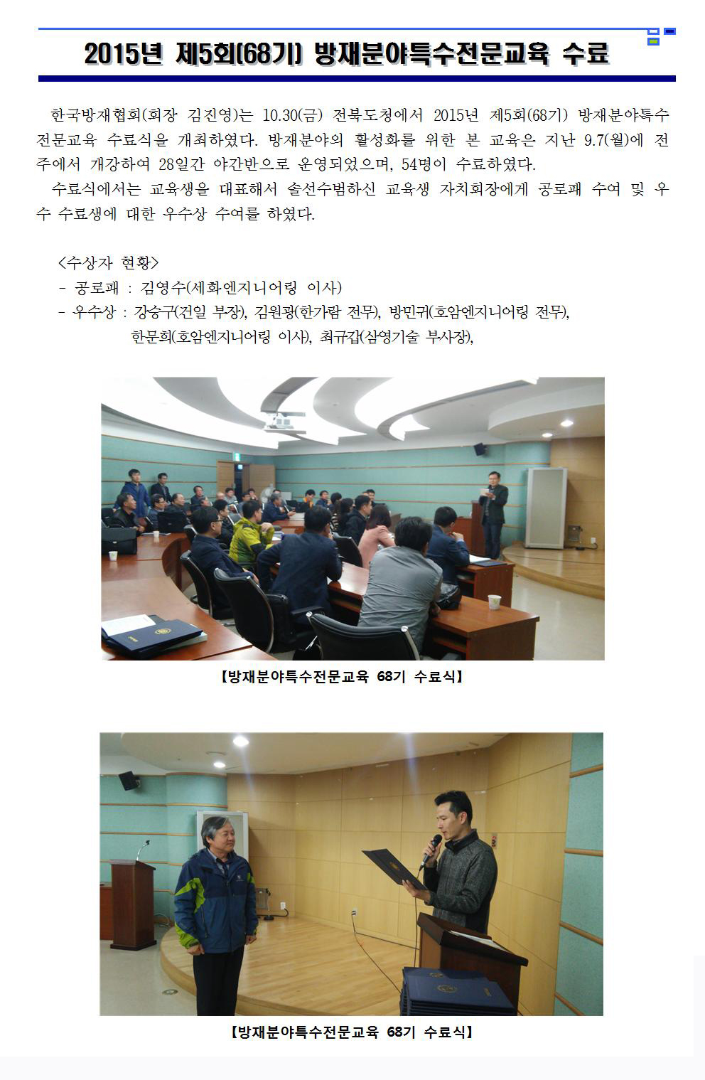 2015년 제5회(68기) 방재분야특수전문교육 수료 2015-11-04 목록보기 이전글김진영 회장, 지자체 등 재난안전부서 국장급·담당자 대상 특강2015.11.05 다음글[축결혼] 우리협회 연구기술실 김진호 연구원 결혼식 알림2015.10.30