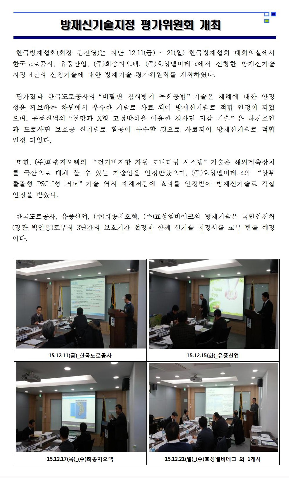 방재신기술지정 평가위원회 개최 2015-12-23 목록보기 이전글한국방재협회, 연말연시를 맞아 직원 봉사활동 참여2015.12.23 다음글[부고] 우리 협회 부회장 국민안전처 안영규 재난예방정책관 부친상 알림2015.12.23