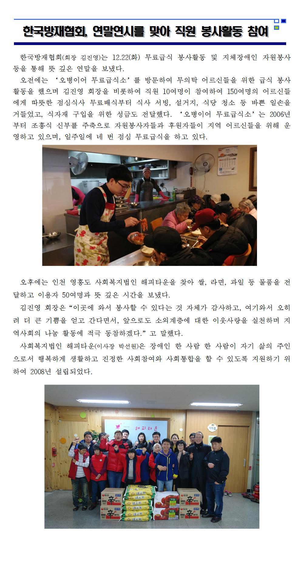 한국방재협회, 연말연시를 맞아 직원 봉사활동 참여 2015-12-23 목록보기 이전글한국방재협회, 2016년 시무식 개최2016.01.04 다음글방재신기술지정 평가위원회 개최2015.12.23