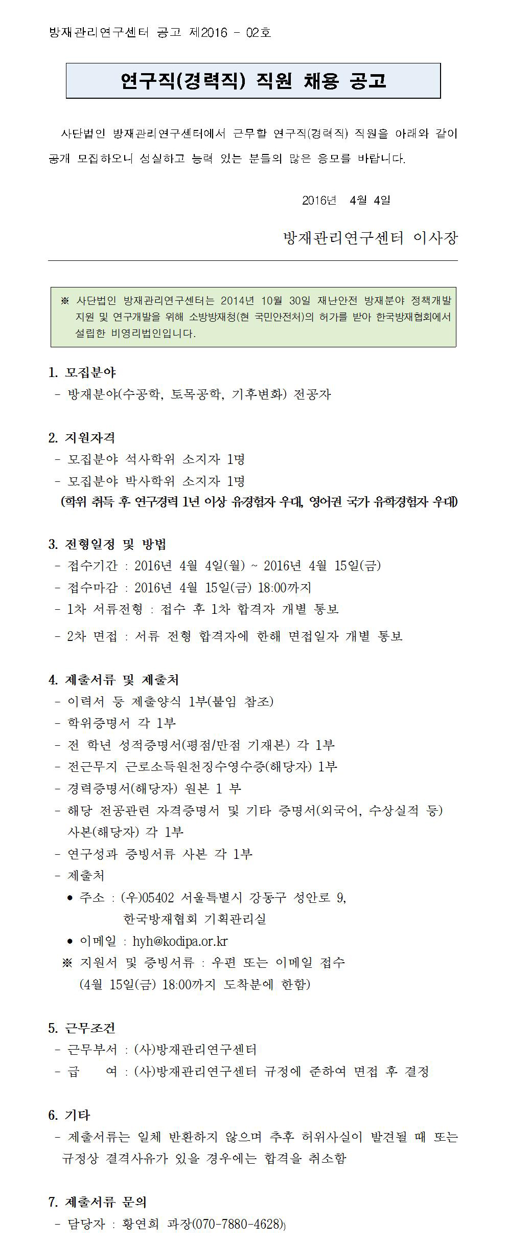 방재관리연구센터 연구직(경력직) 직원 채용 공고 2016-04-04 방재관리센터 연구직 채용공고 지원서 양식.hwp (28672K) 목록보기 이전글김진영 회장, 경기도 재난안전본부 전직원 대상 특강2016.04.18 다음글「제23회 방재의 날」 기념행사 홍보부스 참가협조 요청2016.03.15