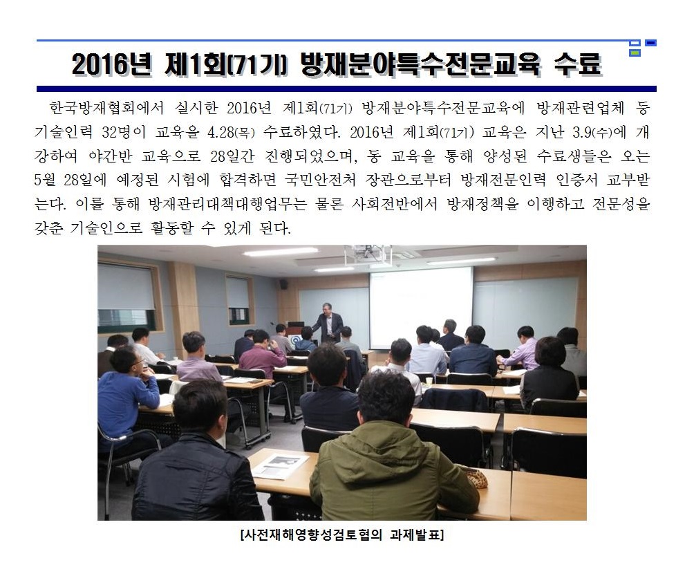 2016년 제1회(71기) 방재분야특수전문교육 수료 2016-05-10 목록보기 이전글2016년 제2회(72기) 방재분야특수전문교육 수료2016.05.20 다음글제67차 이사회 개최2016.04.29