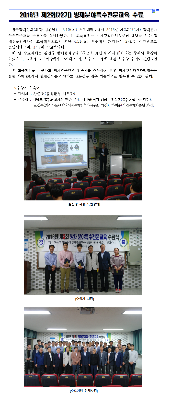 2016년 제2회(72기) 방재분야특수전문교육 수료 2016-05-20 목록보기 이전글한국방재협회 '제23회 방재의 날' 기념행사 개최2016.05.26 다음글2016년 제1회(71기) 방재분야특수전문교육 수료2016.05.10
