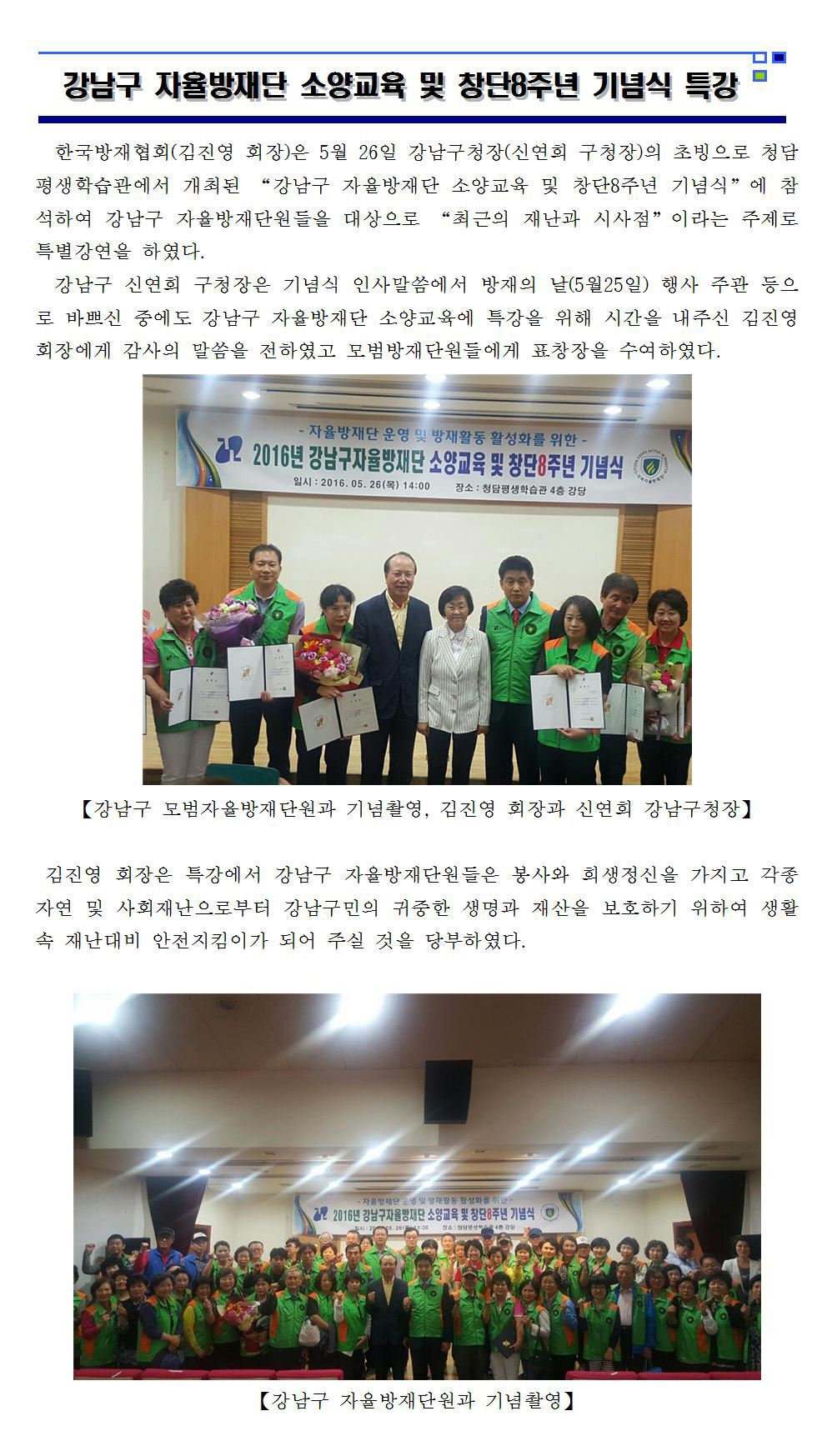 강남구 자율방재단 소양교육 및 창단8주년 기념식 특강 2016-05-27 목록보기 이전글제2회 국제 재난경감 컨퍼런스 개최2016.06.17 다음글한국방재협회 '제23회 방재의 날' 기념행사 개최2016.05.26