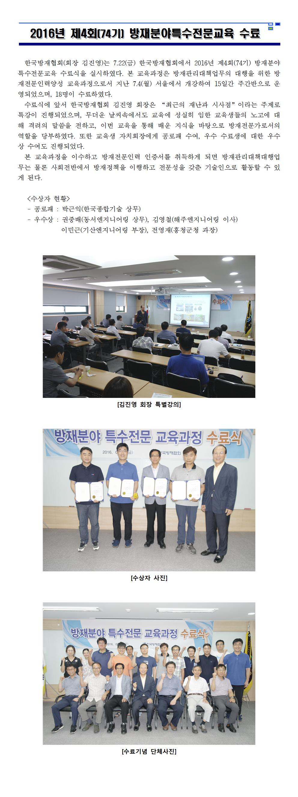 2016년 제4회(74기) 방재분야특수전문교육 수료 2016-07-22 목록보기 이전글[부고] 정종호(하존이앤씨 대표) 모친상2016.08.03 다음글2016년 제3회(73기) 방재분야특수전문교육 수료2016.07.21
