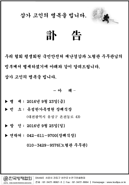 [부고]노형관(국민안전처 재난경감과 주무관) 빙부상 2016-09-23 목록보기 이전글[부고]김 철(호남대학교 교수) 모친상2016.09.26 다음글[부고]이범주(한국종합기술 부장) 부친상2016.09.21