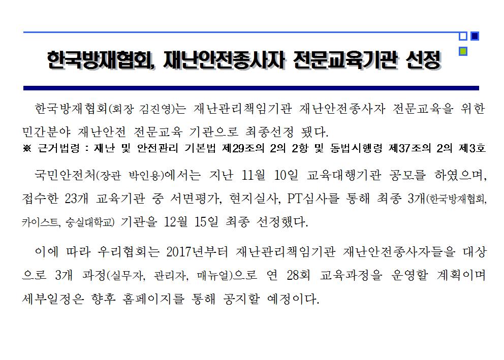 한국방재협회, 재난안전종사자 전문교육기관 선정 2016-12-15 목록보기 이전글2017년 정유년 새해인사2016.12.29 다음글방재관리연구센터 연구직 직원 채용 공고2016.12.15