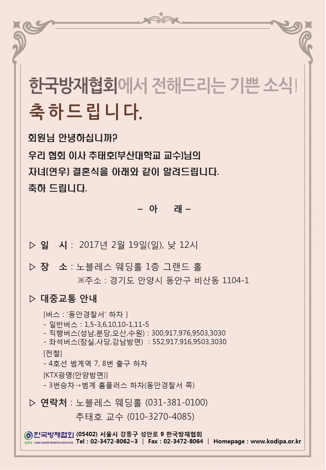 [축결혼] 우리협회 이사 추태호(부산대학교 교수) 자녀 결혼식 알림 2017-02-02 목록보기 이전글2017년 재해대책 유공 정부포상계획 알림2017.02.03 다음글[부고] 변지석 과장(국민안전처 재난보험과장) 부친상2017.02.01