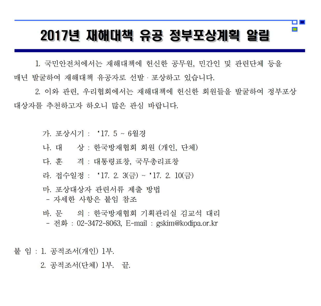 2017년 재해대책 유공 정부포상계획 알림 2017-02-03 붙임 1. 공적조서양식(개인).hwp (21504K) 붙임 2. 공적조서양식(단체).hwp (20480K) 목록보기 이전글제7대 회장후보자 및 선거일정 공고2017.02.13 다음글[축결혼] 우리협회 이사 추태호(부산대학교 교수) 자녀 결혼식 알림2017.02.02