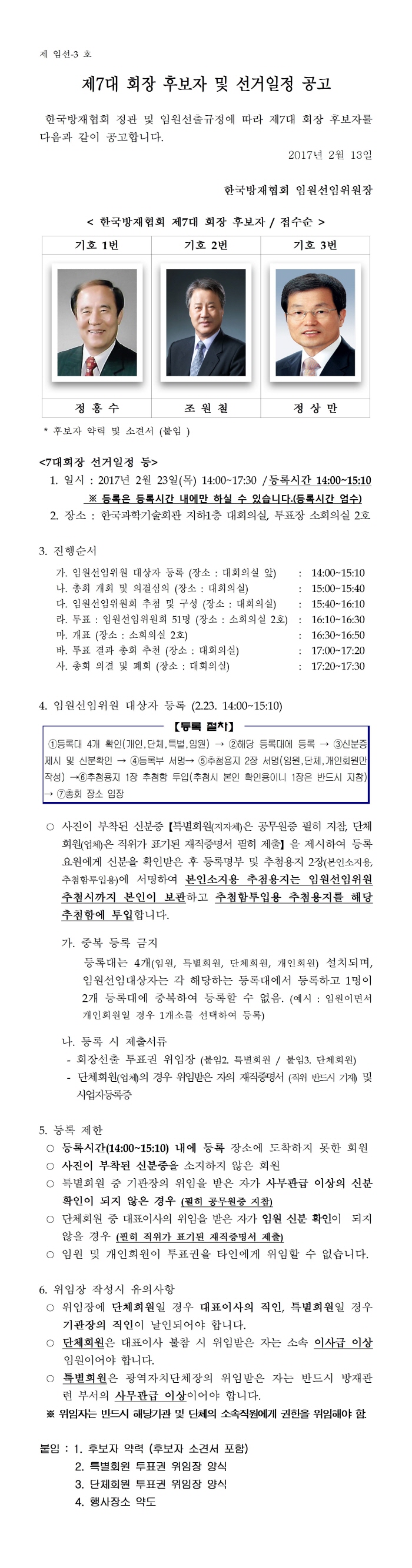 제7대 회장후보자 및 선거일정 공고 2017-02-13 공고3 제7대 회장후보자 및 선거일정 공고(20170213)_붙임_후보자약력.hwp (4225020K) 공고3 제7대 회장후보자 및 선거일정 공고(20170213)_붙임_위임장및약도.hwp (228864K) 목록보기 이전글한국방재협회 제7대 회장 당선인 공고2017.02.23 다음글2017년 재해대책 유공 정부포상계획 알림2017.02.03