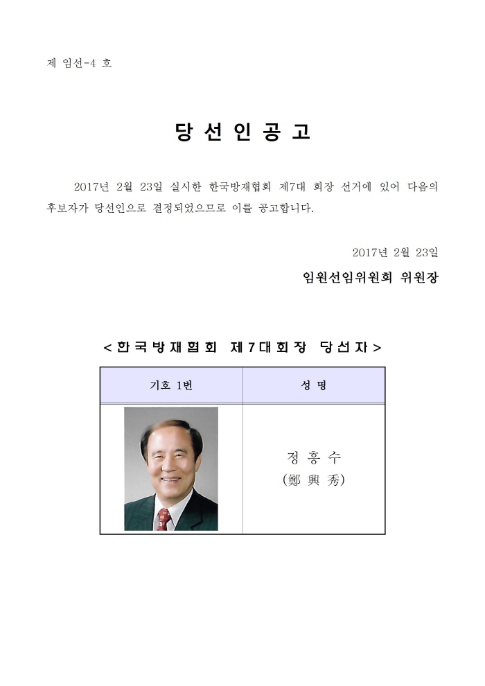 한국방재협회 제7대 회장 당선인 공고 2017-02-23 목록보기 이전글[부고] 정동진 부사장((주)이산) 모친상2017.02.27 다음글제7대 회장후보자 및 선거일정 공고2017.02.13