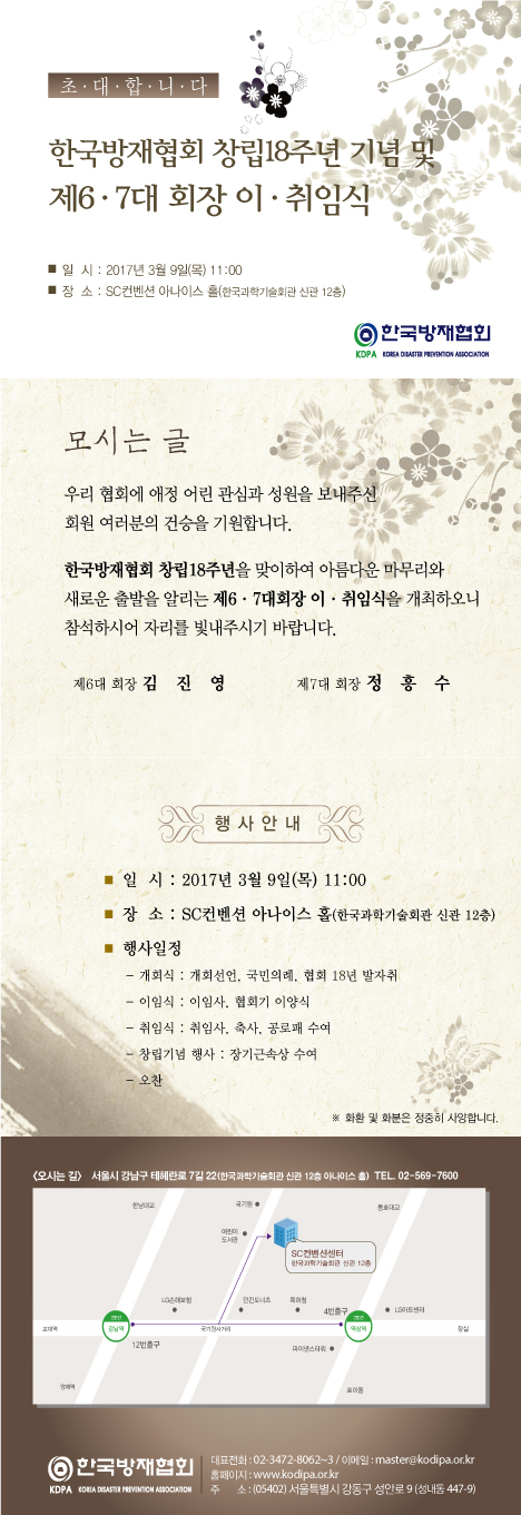 한국방재협회 창립18주년 기념 및 제6·7대 회장 이·취임식 안내 2017-03-03 목록보기 이전글2017 재난사진 공모전2017.03.07 다음글[부고] 정동진 부사장((주)이산) 모친상2017.02.27