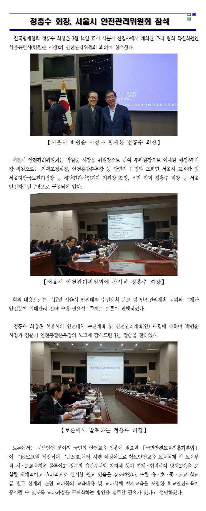 정흥수 회장, 서울시 안전관리위원회 참석 2017-03-15 목록보기 이전글[부고] 김진영 회장(한국방재혐회 6대 회장) 모친상2017.03.21 다음글제7대 한국방재협회 정흥수 회장 취임사2017.03.10