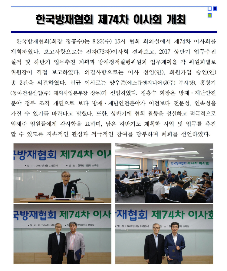 한국방재협회 제74차 이사회 개최 2017-08-23 목록보기 이전글정흥수 회장, 재난안전연구원 개원 20주년 기념식 축사2017.09.01 다음글한국방재협회 국제개발협력사업(ODA) 교육 개최2017.07.31