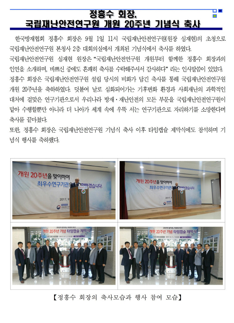 정흥수 회장, 재난안전연구원 개원 20주년 기념식 축사 2017-09-01 목록보기 이전글제1회 컨소시엄운영위원회 개최2017.09.06 다음글한국방재협회 제74차 이사회 개최2017.08.23