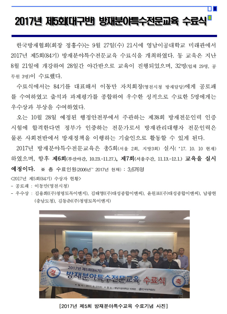 2017년 제5회(대구반) 방재분야특수전문교육 수료식 2017-10-10 목록보기 이전글한국방재협회 방재저널 제77호 편집기획회의 개최2017.10.19 다음글한국방재협회 정규직원(행정직) 채용 공고2017.10.10
