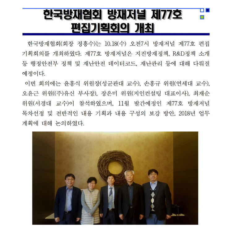 한국방재협회 방재저널 제77호 편집기획회의 개최 2017-10-19 목록보기 이전글방재정책실행위원회 위원장 업무간담회 개최2017.11.06 다음글2017년 제5회(대구반) 방재분야특수전문교육 수료식2017.10.10