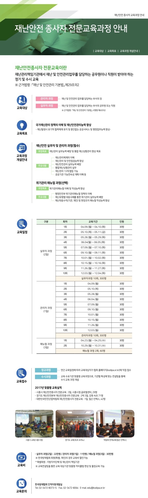 2018년 재난안전종사자 전문교육과정 개설안내 2018-02-07 목록보기 이전글2018년 방재분야특수전문교육 개설 안내2018.02.12 다음글방재정책실행위원회 위원장 업무간담회 개최2018.02.05
