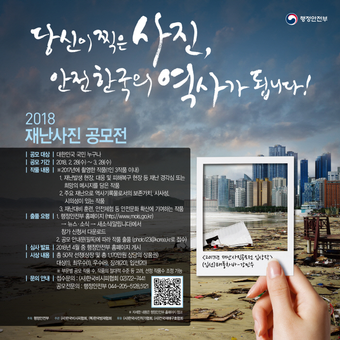 2018 재난사진 공모전 2018-02-27 ※ 자세한 내용은 첨부파일(안내문, 신청서) 참고 바랍니다. ★2018년 재난사진 공모전 안내문 ver4.hwp (23552K) 목록보기 이전글2018 재난예방 포스터 공모전2018.02.27 다음글2018년 방재분야특수전문교육 개설 안내2018.02.12