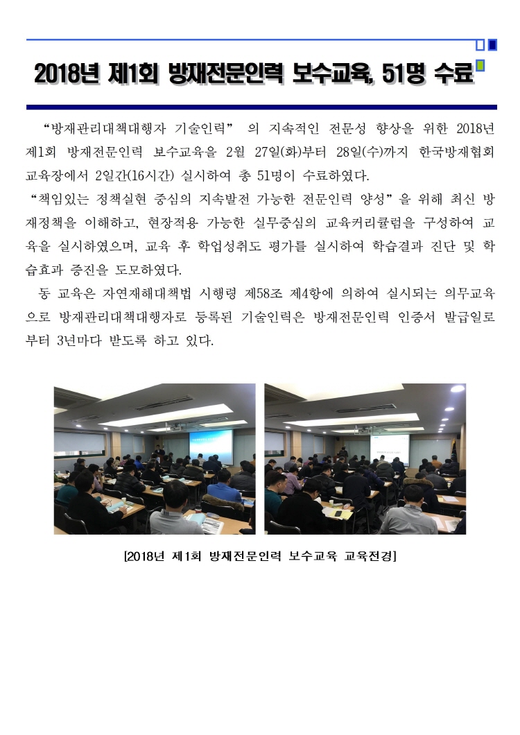 2018년 제1회 방재전문인력 보수교육 수료 2018-03-02 목록보기 이전글2018년 제1회 기업재난관리사 대행과정 개설 안내2018.03.22 다음글2018 재난예방 포스터 공모전2018.02.27
