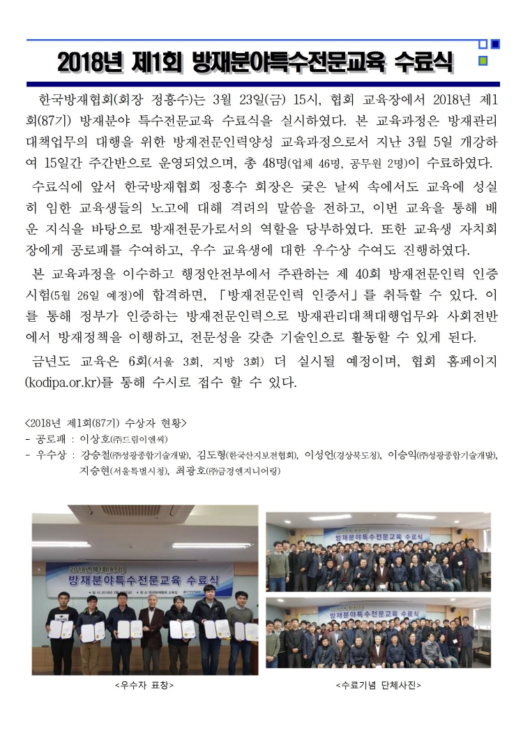 2018년 제1회 방재분야특수전문교육 수료 2018-03-26 목록보기 이전글2018년 제2회 방재전문인력 보수교육 수료2018.03.26 다음글2018년 제1회 기업재난관리사 대행과정 개설 안내2018.03.22