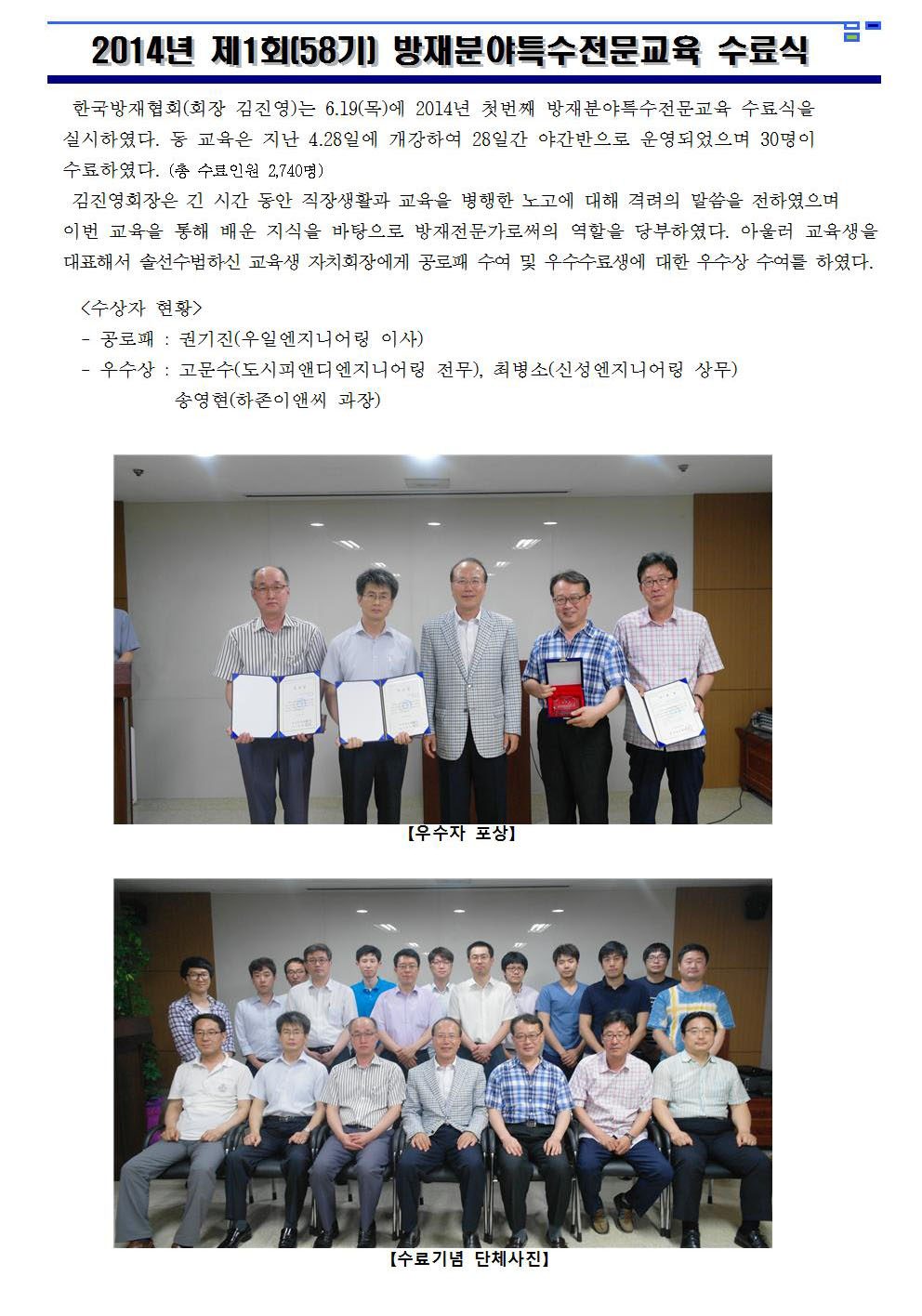 2014년 제1회(58기) 방재분야특수전문교육 수료식 2014-06-20 목록보기 이전글2014년 제2회(59기) 방재분야특수전문교육 수료식2014.06.23 다음글김진영 한국방재협회장 특별강의2014.06.20