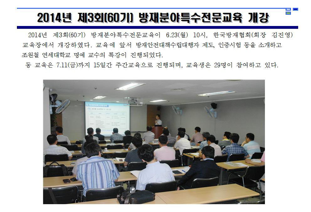 2014년 제3회(60기) 방재분야특수전문교육 개강 2014-06-23 목록보기 이전글국가인적자원개발 컨소시엄 운영위원회 개최2014.06.27 다음글2014년 제2회(59기) 방재분야특수전문교육 수료식2014.06.23