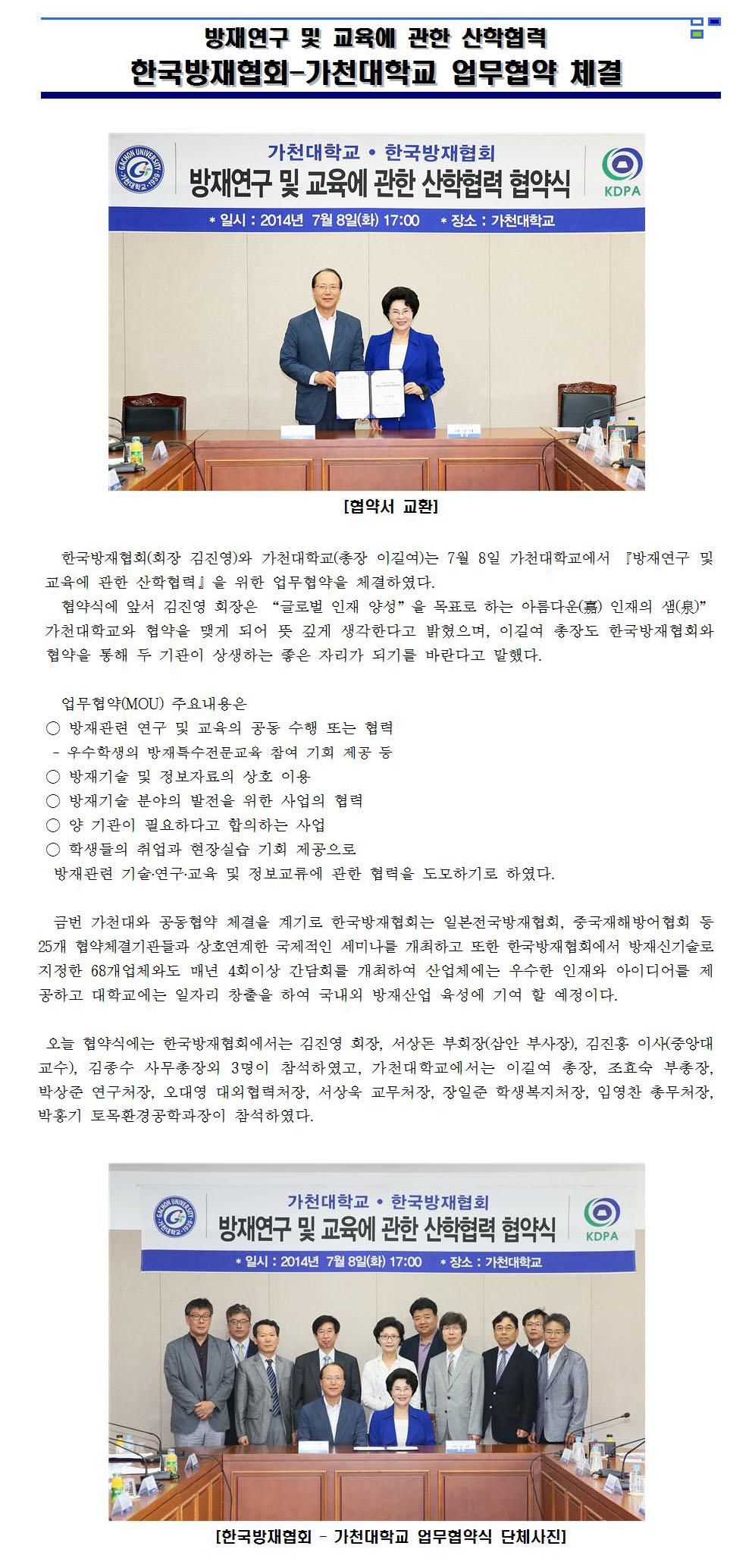 "한국방재협회-가천대학교" 업무협약 체결 2014-07-08 목록보기 이전글방재저널 제60호 편집기획회의 개최2014.07.07 다음글소방방재청 산하단체(방재협회) 개혁방안 보고회2014.07.04