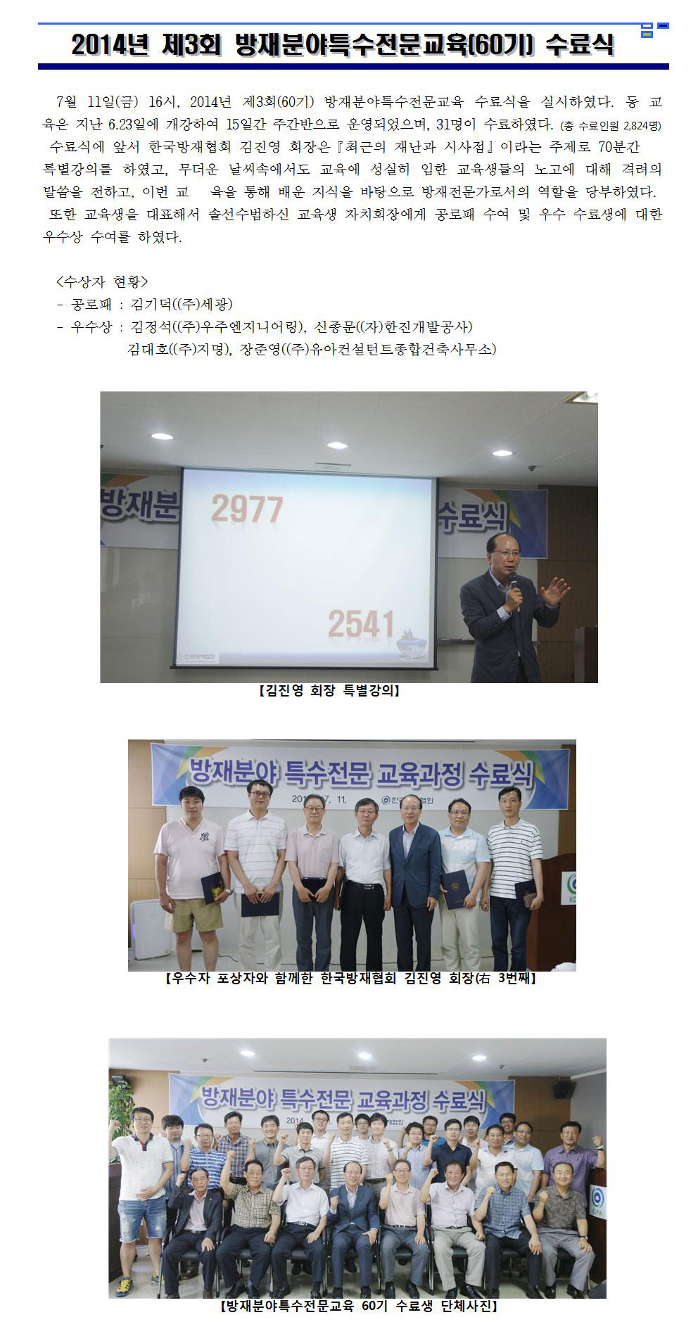 2014년 제3회 방재분야특수전문교육(60기) 수료식 2014-07-11 목록보기 이전글협회 정기간행물 『방재저널(59호) 발간2014.07.17 다음글방재저널 제60호 편집기획회의 개최2014.07.07