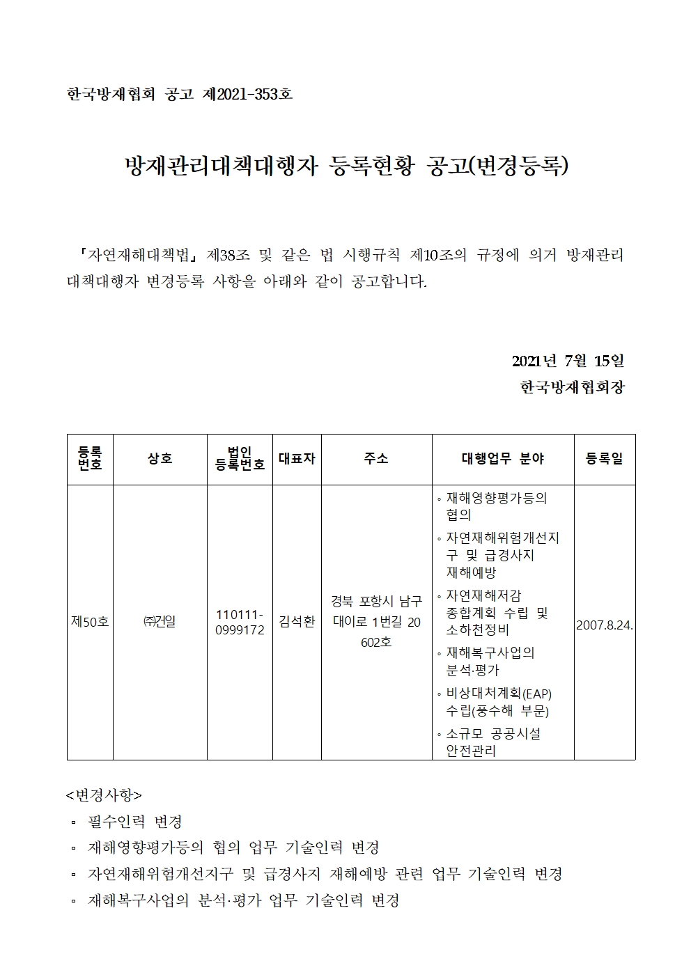방재관리대책대행자 등록현황 공고(변경등록) - (주)건일 2021-07-15 공고문_제2021-353호_방재대행자 등록현황 공고(변경)_(주)건일.pdf (70553K) 목록보기 이전글방재관리대책대행자 등록현황 공고(변경등록) - (주)경호엔지니어링종합건축사사무소2021.07.15 다음글방재관리대책대행자 등록현황 공고(변경등록) - (주)하이콘엔지니어링2021.07.15
