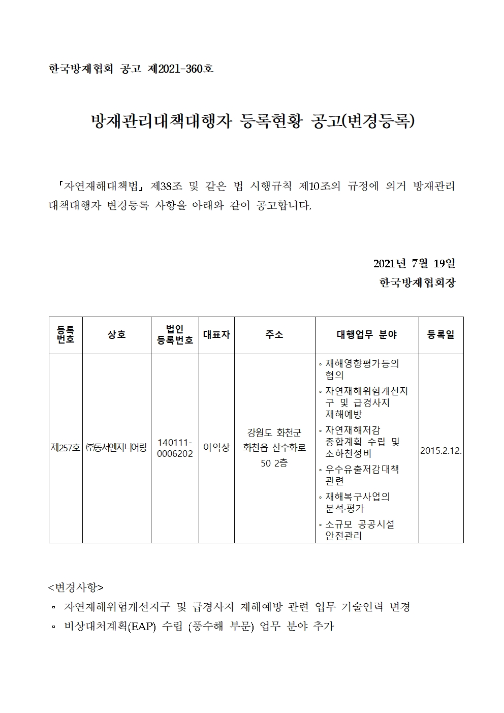 방재관리대책대행자 등록현황 공고(변경등록) - (주)동서엔지니이링 2021-07-19 공고문_제2021-360호_방재대행자 등록현황 공고(변경)_(주)동서엔지니어링.pdf (72232K) 목록보기 이전글방재관리대책대행자 등록현황 공고(변경등록) - (주)로텍엔지니어링2021.07.19 다음글방재관리대책대행자 등록현황 공고(변경등록) - (주)일신이앤씨2021.07.19