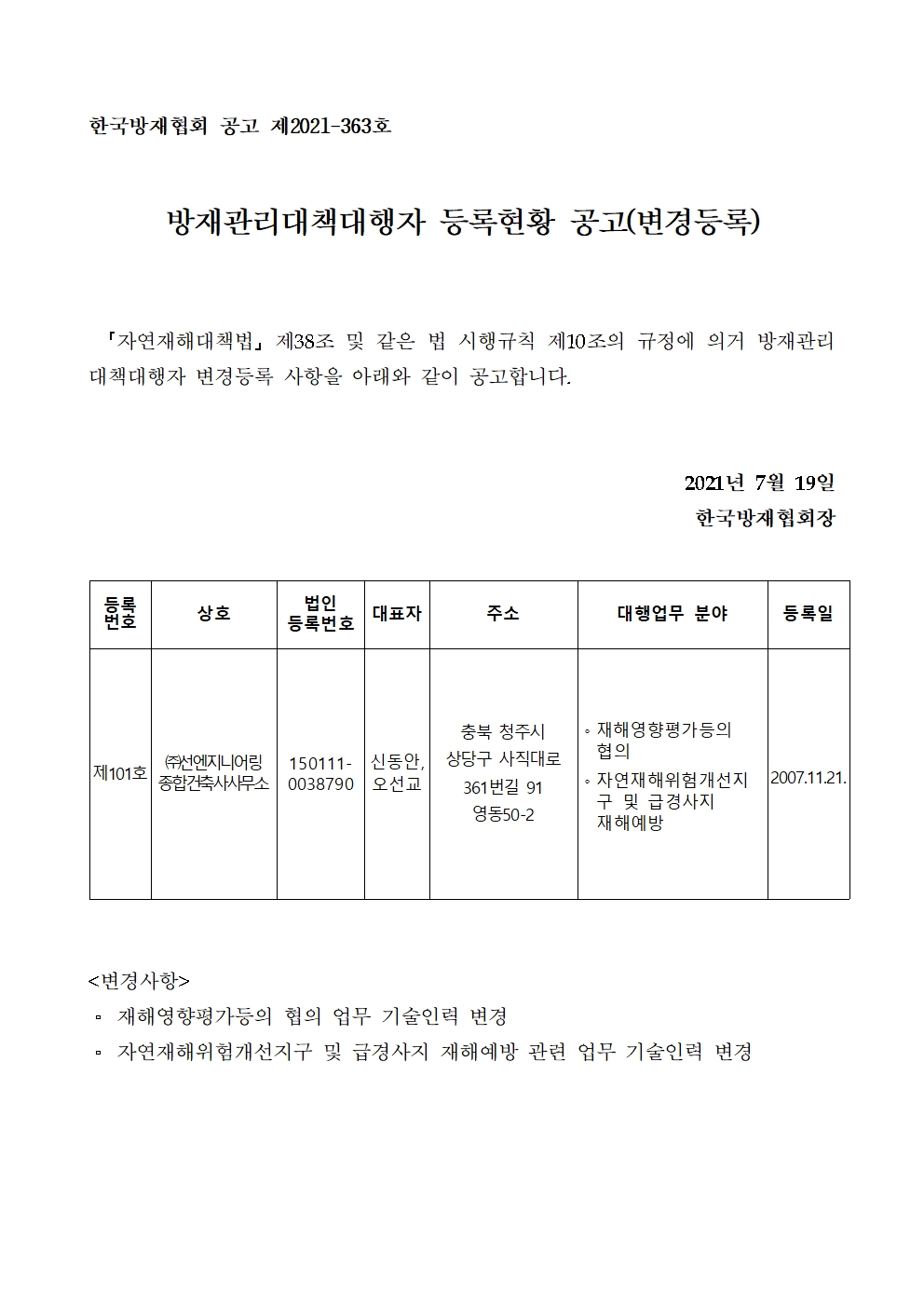 방재관리대책대행자 등록현황 공고(변경등록) - (주)선엔지니어링종합건축사사무소 2021-07-20 공고문_제2021-363호_방재대행자 등록현황 공고(변경)_(주)선엔지니어링종합건축사사무소.pdf (64275K) 목록보기 이전글방재관리대책대행자 등록현황 공고(신규등록) - (주)에이치케이이앤씨2021.07.21 다음글방재관리대책대행자 등록현황 공고(변경등록) - 주식회사 태신엔지니어링2021.07.19