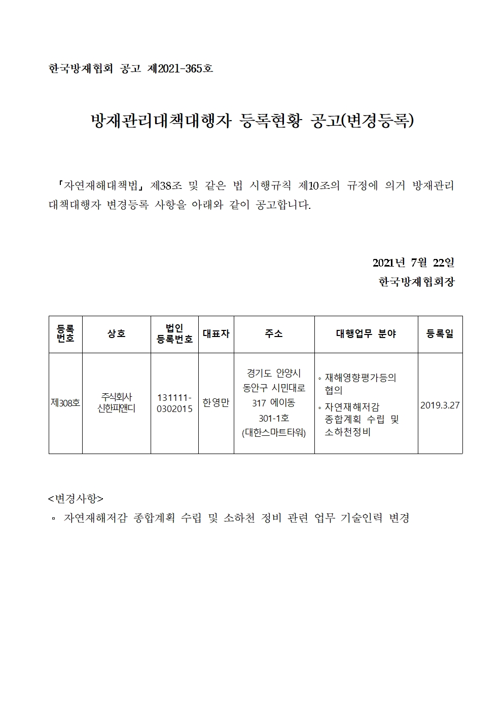 방재관리대책대행자 등록현황 공고(변경등록) - 주식회사 신한피앤디 2021-07-22 공고문_제2021-365호_방재대행자 등록현황 공고(변경)_주식회사_신한피앤디.pdf (63426K) 목록보기 이전글방재관리대책대행자 등록현황 공고(변경등록) - (주)중앙방재엔지니어링2021.07.22 다음글방재관리대책대행자 등록현황 공고(신규등록) - (주)에이치케이이앤씨2021.07.21