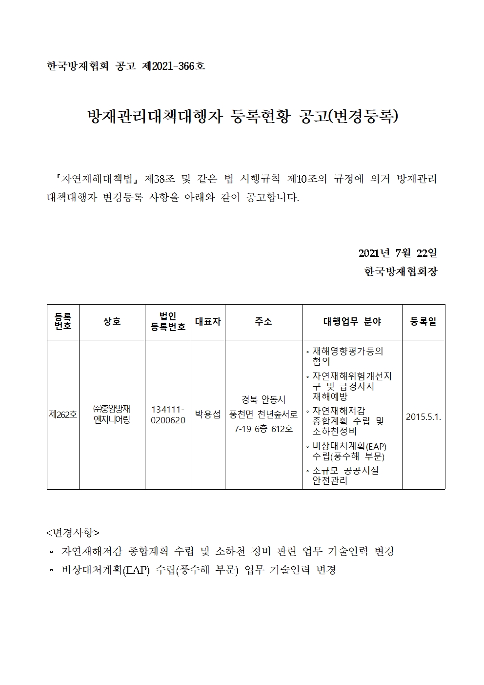 방재관리대책대행자 등록현황 공고(변경등록) - (주)중앙방재엔지니어링 2021-07-22 공고문_제2021-366호_방재대행자 등록현황 공고(변경)_(주)중앙방재엔지니어링.pdf (70777K) 목록보기 이전글방재관리대책대행자 등록현황 공고(변경등록) - (주)대한2021.07.22 다음글방재관리대책대행자 등록현황 공고(변경등록) - 주식회사 신한피앤디2021.07.22
