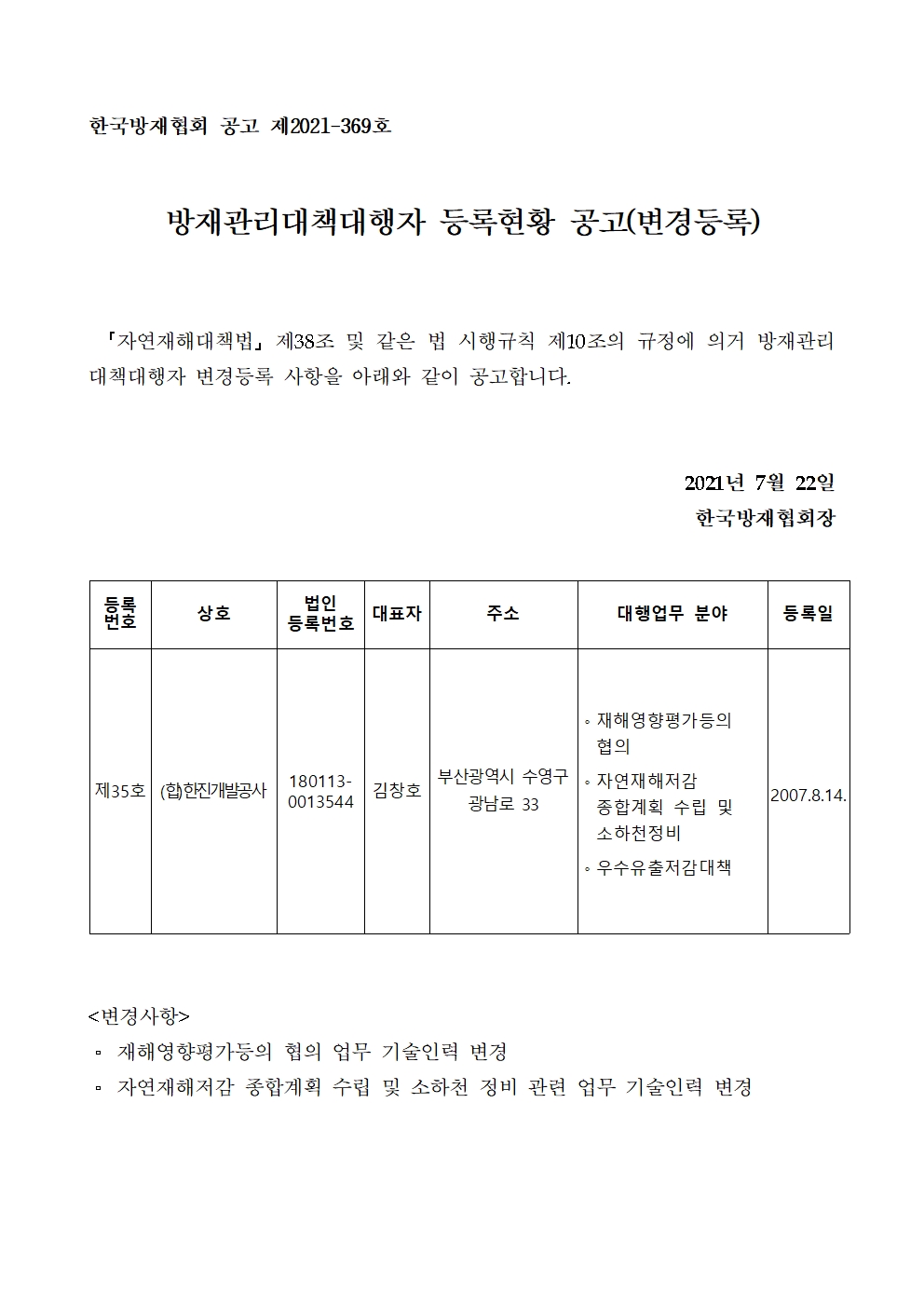 방재관리대책대행자 등록현황 공고(변경등록) - (합)한진개발공사 2021-07-22 공고문_제2021-369호_방재대행자 등록현황 공고(변경)_(합)한진개발공사.pdf (63718K) 목록보기 이전글방재관리대책대행자 등록현황 공고(변경등록) - (주)건영엔지니어링2021.07.22 다음글방재관리대책대행자 등록현황 공고(변경등록) - (주)한성개발공사2021.07.22