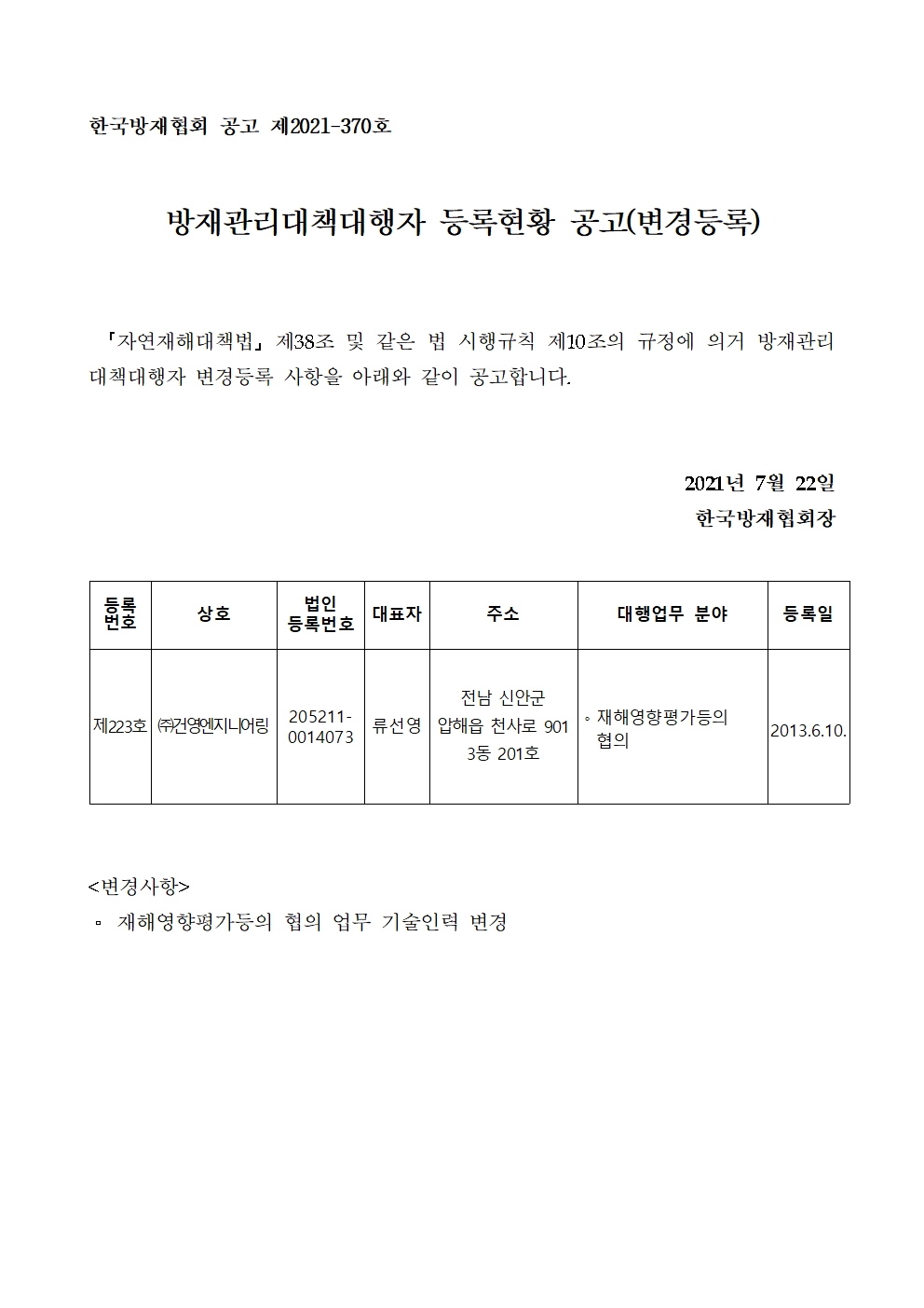 방재관리대책대행자 등록현황 공고(변경등록) - (주)건영엔지니어링 2021-07-22 공고문_제2021-370호_방재대행자 등록현황 공고(변경)_(주)건영엔지니어링.pdf (57321K) 목록보기 이전글방재관리대책대행자 등록현황 공고(변경등록) - (주)두레2021.07.22 다음글방재관리대책대행자 등록현황 공고(변경등록) - (합)한진개발공사2021.07.22