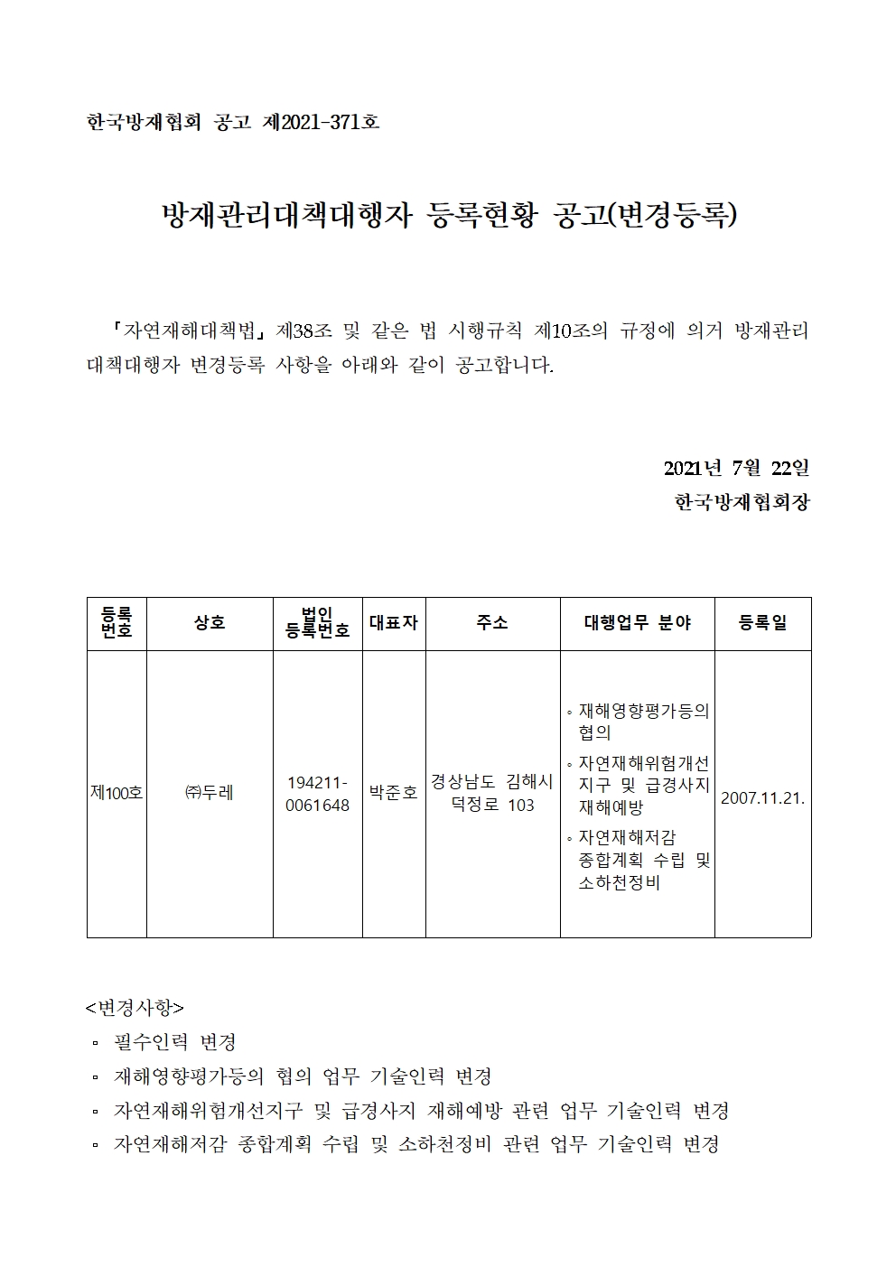 방재관리대책대행자 등록현황 공고(변경등록) - (주)두레 2021-07-22 공고문_제2021-371호_방재대행자 등록현황 공고(변경)_(주)두레.pdf (65790K) 목록보기 이전글방재관리대책대행자 등록현황 공고(업무휴업) - (주)두레2021.07.22 다음글방재관리대책대행자 등록현황 공고(변경등록) - (주)건영엔지니어링2021.07.22